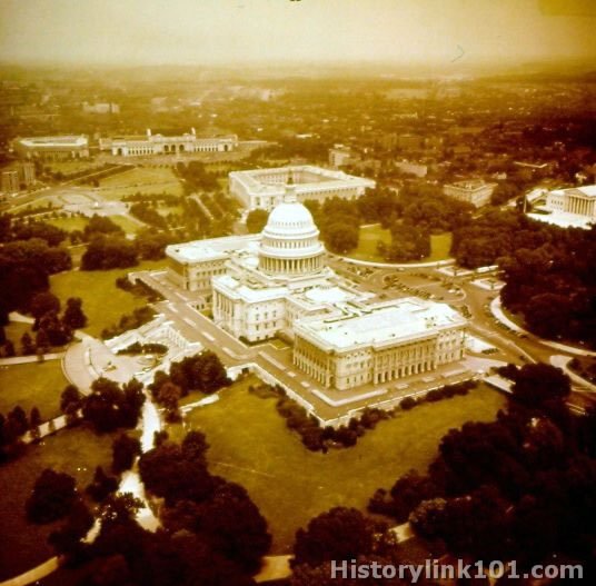Buildings in Washington, DC. Taken from US Navy blimp from NPC Anacostia. Senate office building. August 5, 1956