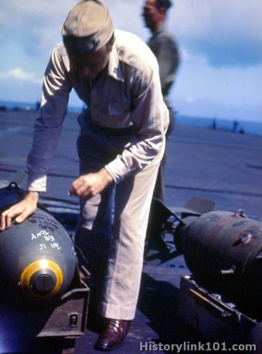 An officer checking 500 pound bombs on flight deck of USS Bennington.