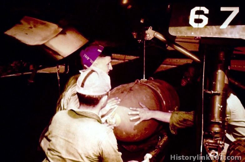 Ordnance men load 500 lb. GP bomb on a Grumman "Hellcat" F6F aboard the USS Bennington. July 25, 1945