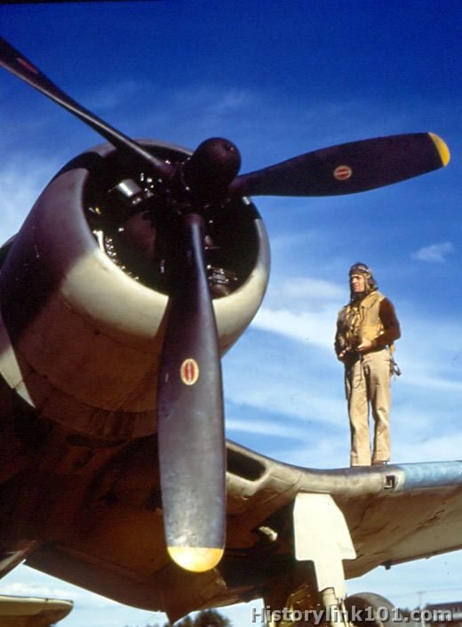 Activities of Royal Navy Air Force Squadron at US Naval Air Station. Pilot stands on wing of F4U.