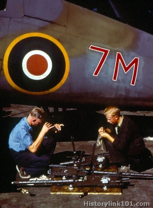 Activities of Royal Navy Air Force Squadron at US Naval Air Station. Ordnancemen clean .50 cal. guns of F4U.
