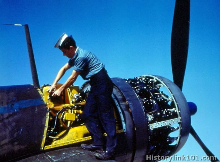 Activities of Royal Navy Air Force Squadron at US Naval Air Station. Mechanic works on engine of F4U.