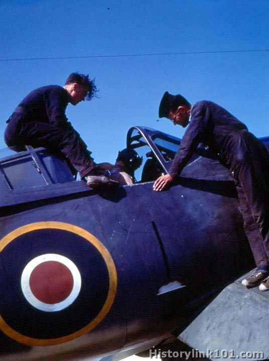 Activities of Royal Navy Air Force Squadron at US Naval Air Station. Ground crewmen gather around cokpit of F4U as pilot checks instruments.