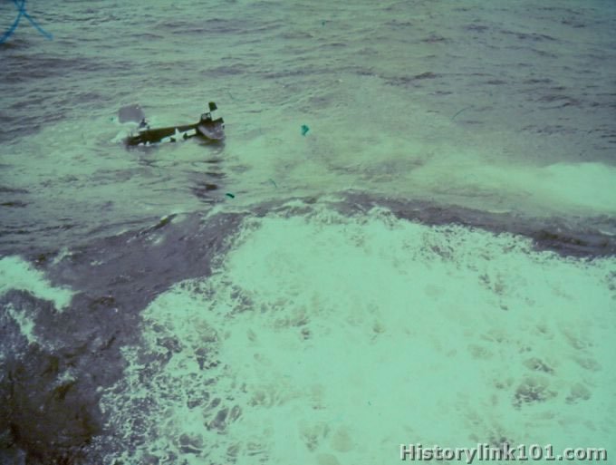 F6F sinking after crashing in water, as seen from USS Hornet, pilot coming up on wing.