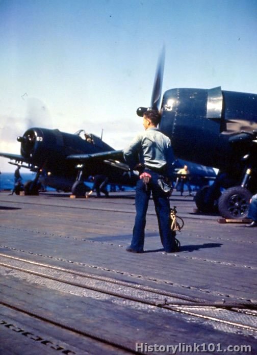 F6F planes shown ready for take off on flight deck of USS Bennington.