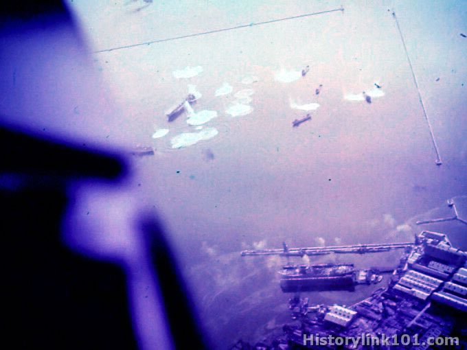 Aerial of Mitsubishi Steel Works at Kobe, Japan under attack by Navy carrier based planes. Several Japs ships off shore. Taken from plane from USS Hancock. March 19, 1945