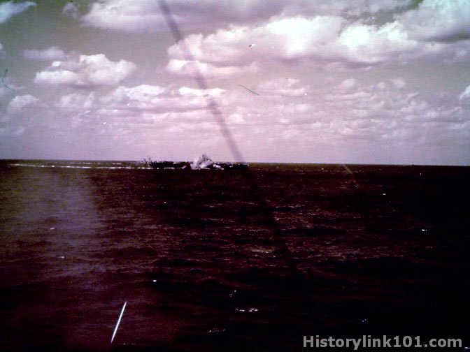 Jap "Kamikazi" attack on Essex Class carrier and on Task Force; taken from the USS Wisconsin. March 18, 1945
