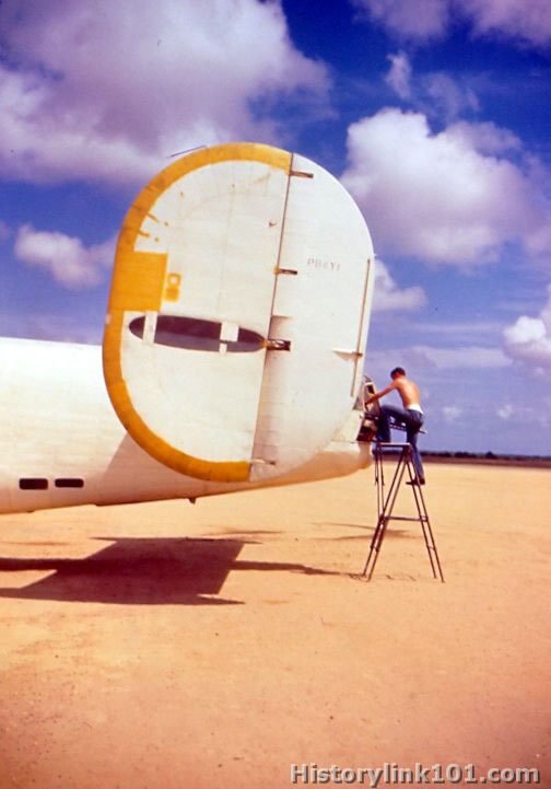 US Navy Liberators operated form Brazilian Base against subs. Armorers work on 50 cal. machine guns in the tail stinger of a USN Liberator before taking off on anti-submarine patrol from Brazil.