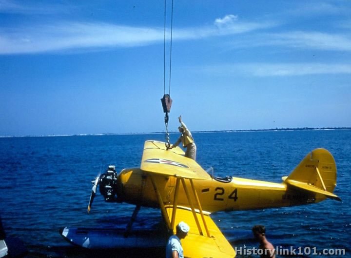 N3N-3 is hoisted out of water by crane after training flight by instructor and aviation cadet.
