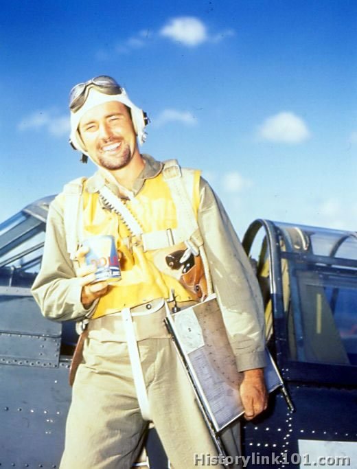 USN pilot drinks can of fruit juice on wing of TBF before climbing into cockpit to go aloft from USS Yorktown. Oct. 1943