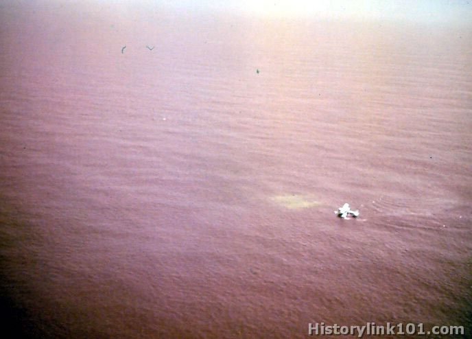 A Navy plane spots downed flier in rubber life raft surrounded by green dye, special chemical which Navy supplies its pilots to make the easier to spot when forced downed at sea.