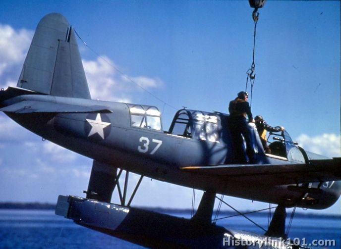 OS2U is lowered into water by crane as pilot and gunner stand by cockpit ready for flight.
