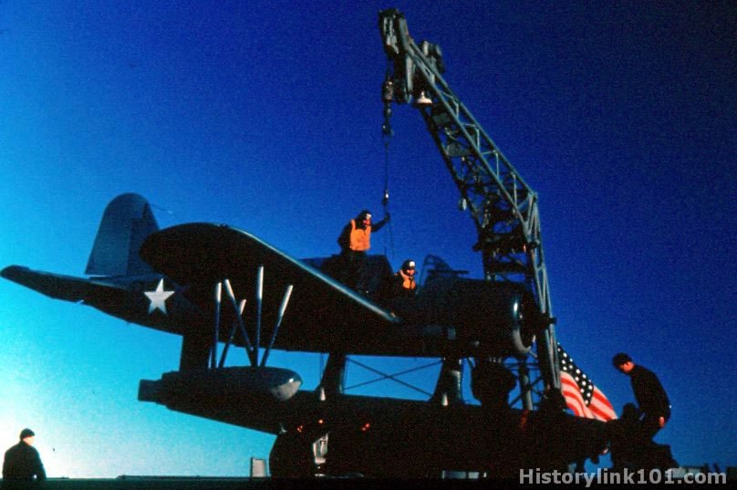 OS2U is lowered onto catapult of US Battleship.