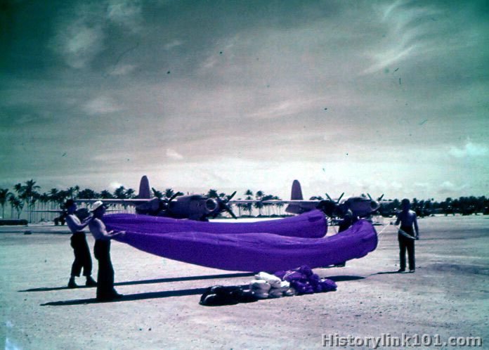 Readying target sleeve which will be towed behind plane for gunnery practice. Dec. 14, 1944