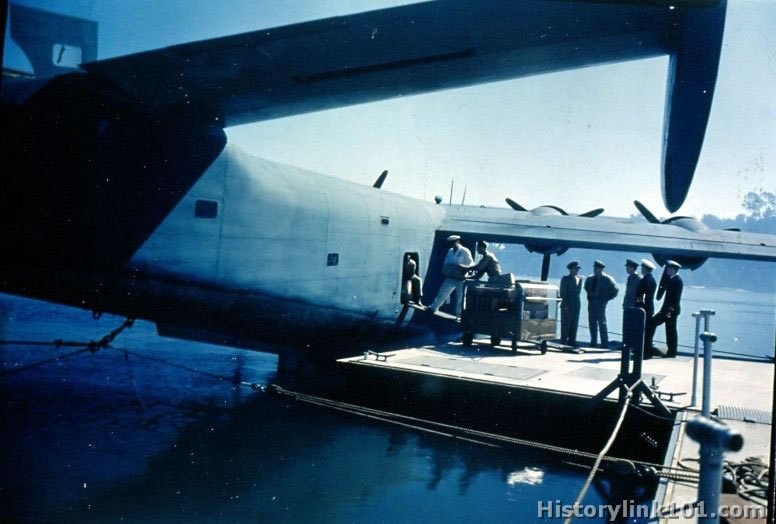 Planes and activities of the Naval Air Transportation Service. Air cargo going aboard the PB2Y-3R for flight across the Pacific is handed aboard piece by piece. Every item gets special handling because the very fact that it is marked for air shipment is prima-facie evidence of its importance.