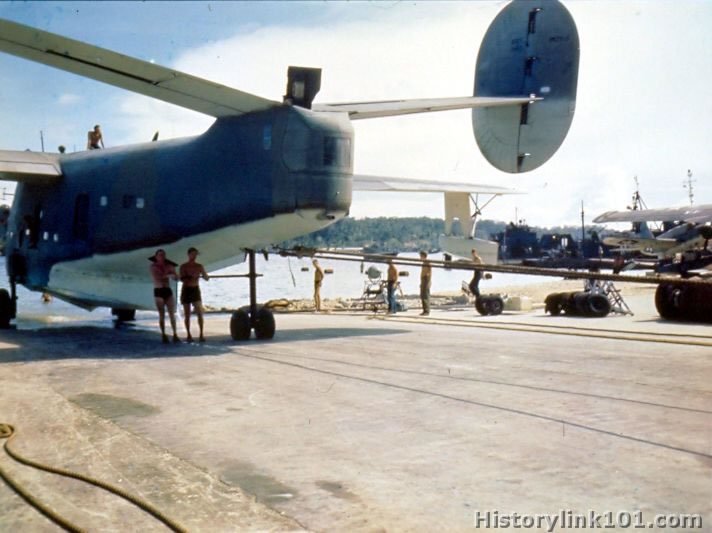 Men wounded in the Philippines at a Seaplane Base in the Admirality Islands. They are being brought back to the states. Sailors with tractor tow ropes carefully guide the PB2Y up the ramp.
