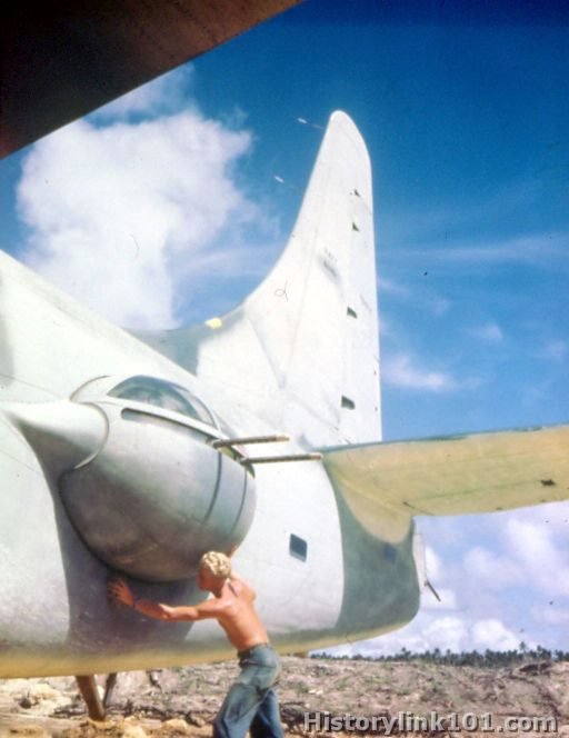 Ground crewman cleans fuselage of PB4Y-2 at Philippine Island Base.