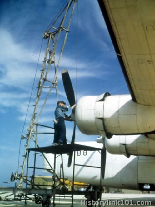 Activities of PB4Y Squadron at East Coast Naval Air Station. Installing prop on engine. Feb. 1944