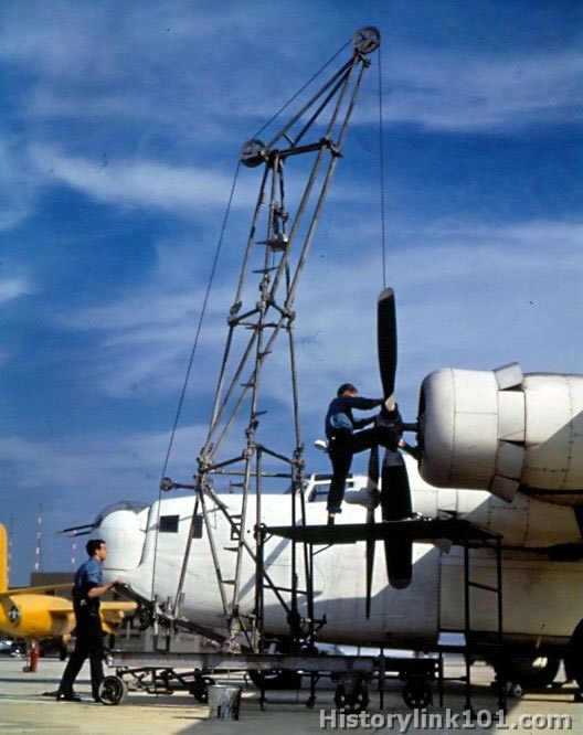 Aviation mechanics install prop on port engine of PB4Y with aid of crane.