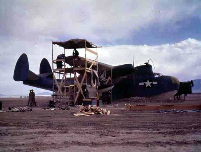Martin engineers and Navy mechanics repair PBM forced down by engine failure in Arizona desert.
