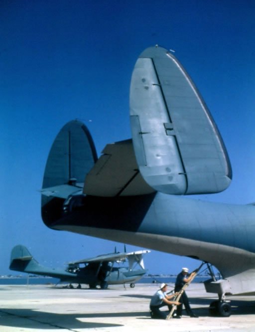 Activities of PBM Squadron at Naval Air Station. Ground crewmen secure line to tail section. PBY is in background.