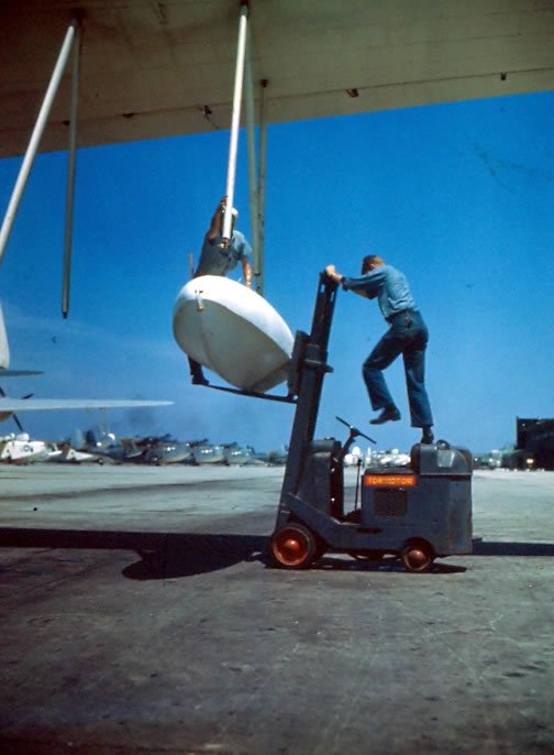 PBM "Mariner" at NAS Norfolk, VA. Fork lift truck at work lifting new float for plane.