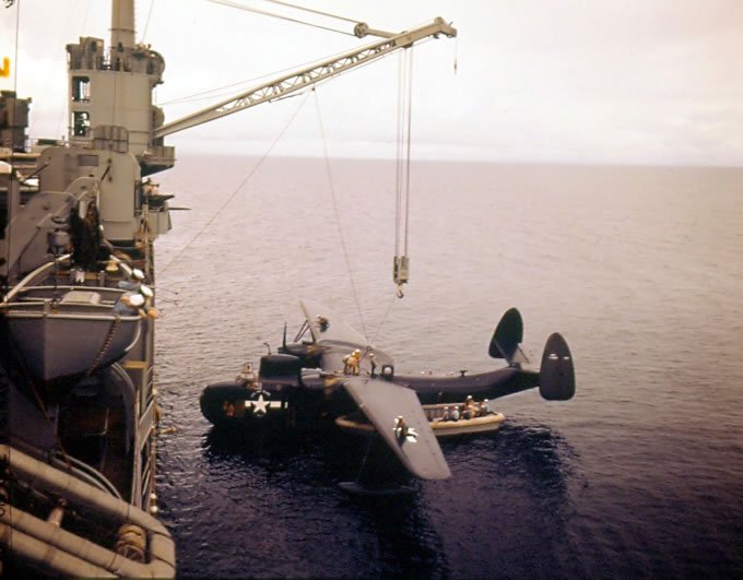 USS Pine Island st'bd crane lifting PBM aboard, Bay of Panama. Dec. 10, 1946