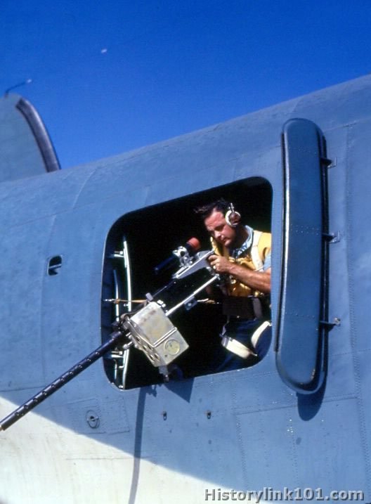 Side gunner of PBM trains sights of .50 cal. free gun.