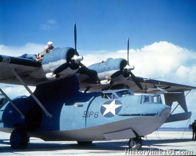 Aviation machinists mates check engines of PBY at East Coast Naval Air Station.