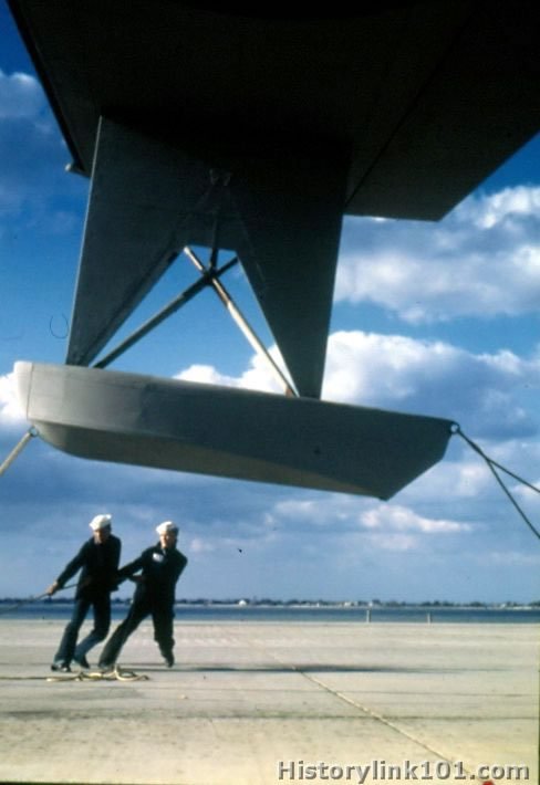 Activities of PBY Squadron. Ground crewmen secure line to pontoon.
