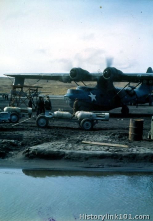 Ground crewmen prepare to load bombs on PBY as plane warms up for flight at Adak in Aleutians.