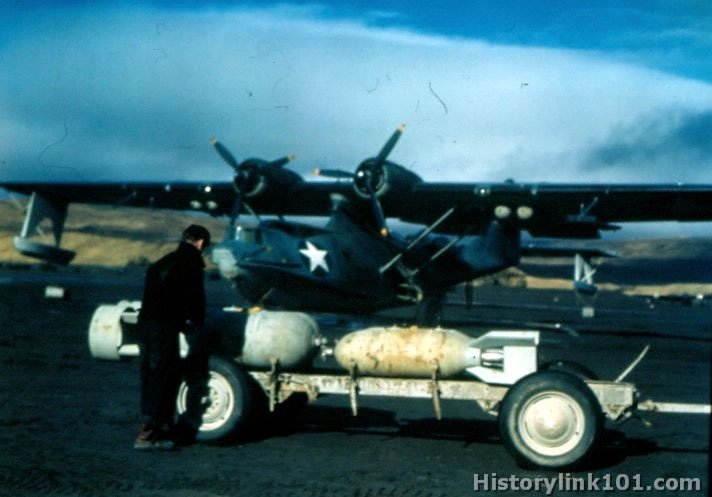 Activities of PBY Squadron. Ordnanceman prepares to load bombs on plane.