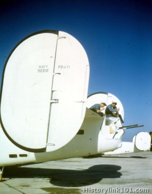 Ground crewmen repair tail turret of PB4Y at Naval Air Station.