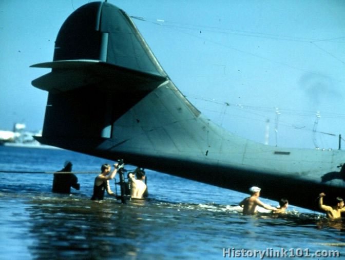 Activities of PBY Squadron. Beaching crew attaches landing gear to tail of plane in water.