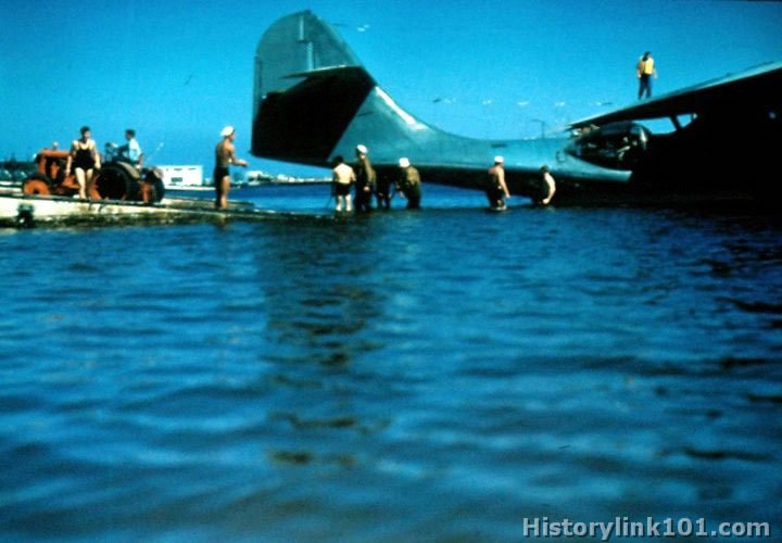 Activities of PBY Squadron. Beaching crew tows plane up ramp with tractor.
