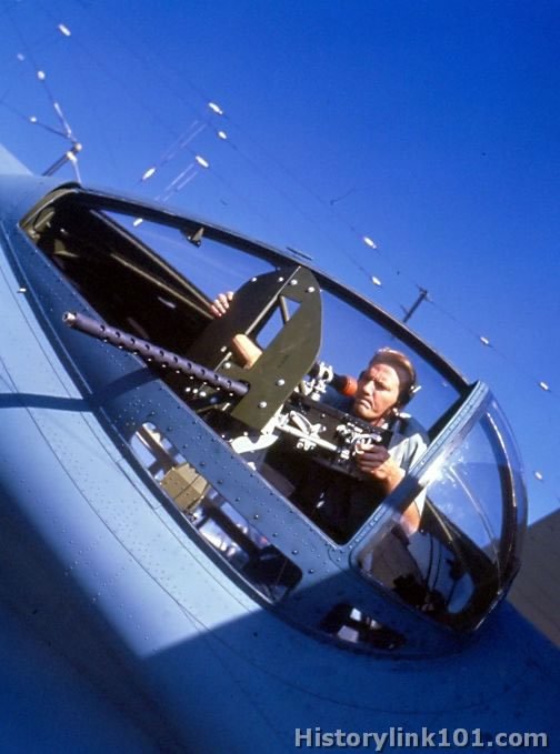 Waist gunner of PBY-5 sights 50 cal machine gun.
