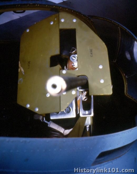 Aerial gunner operates 30 cal. machine gun in blister turret of PBY.