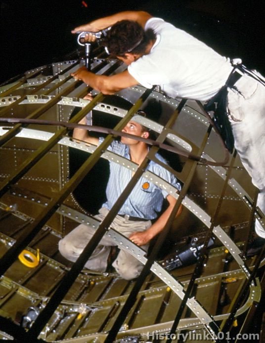 Two workers rivet hull of PB4Y at Consolitader Vulter Aircraft Plant. 1943