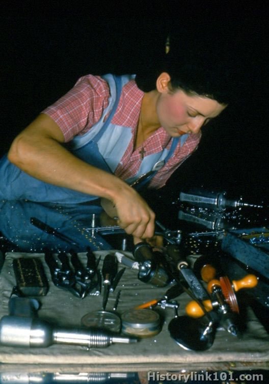 Woman worker sets rivets on wing of plane at aircraft plans.