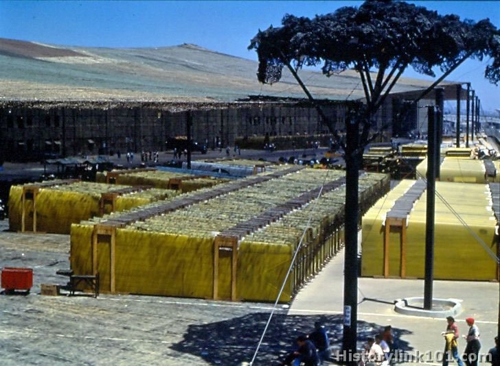 Activity at Consolidated Vultee plant, San Diego, CA where PBY's and PB2Y's are built. Stacked wing panels for PBY-5A's are shown in yard of plant #2.