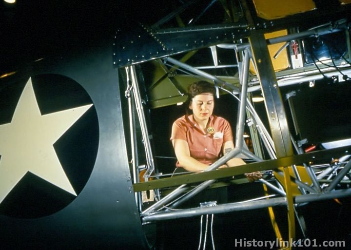 Activity at Consolidated Vultee plant, Downey, CA. Woman works on inside of SNV fuselage. July 1943