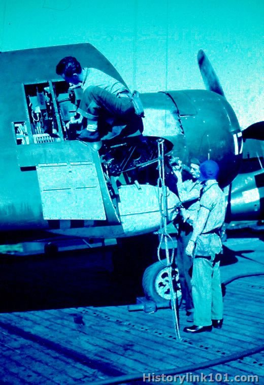 Re-arming and re-fueling FM-2 on USS Makin Island during Iwo Jima operations.