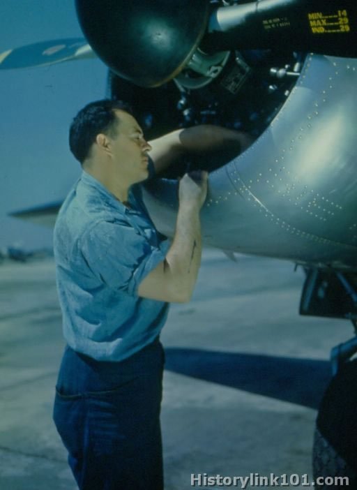 Inspection of SNB engine for possible repairs at NAS Norfolk. April 20, 1945