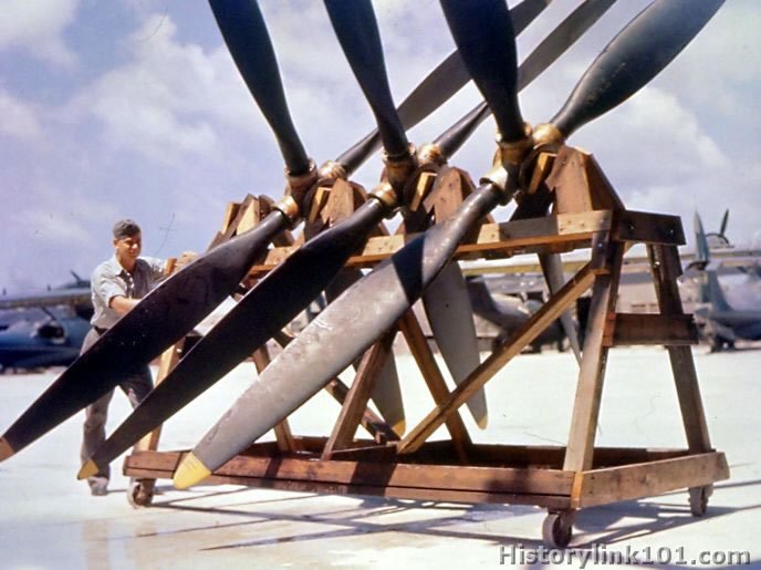 A US Naval Repair Base at a far Pacific outpost. Props for the engines of a Navy search plane. Sept. 1948