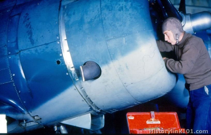 Plane captain makes routine check of fighters engine on hangar deck of carrier.
