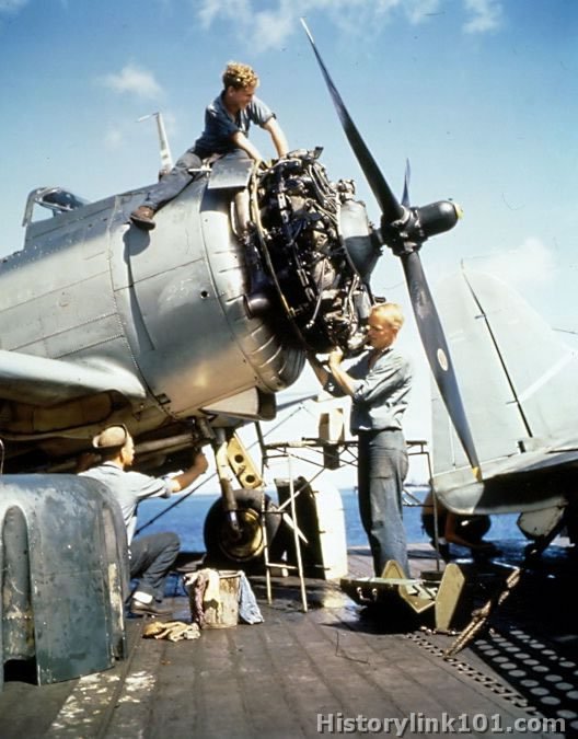 Mechanics overhaul engine of F6F on carrier in Pacific.