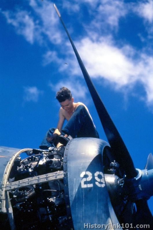 Aviation mechanic works on engine of F6F.