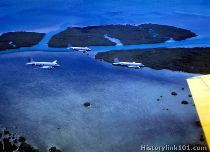 Three R4D's fly in formation over Florida keys on way south with mail and supplies.