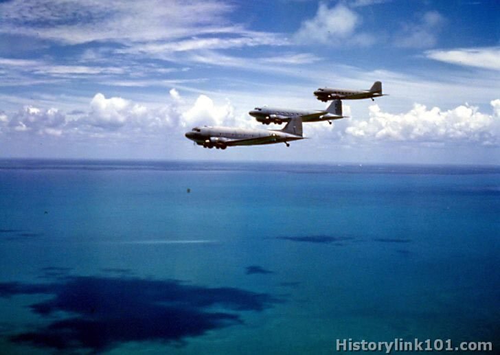 Three R4D's fly in formation over Florida keys on way south with mail and supplies.