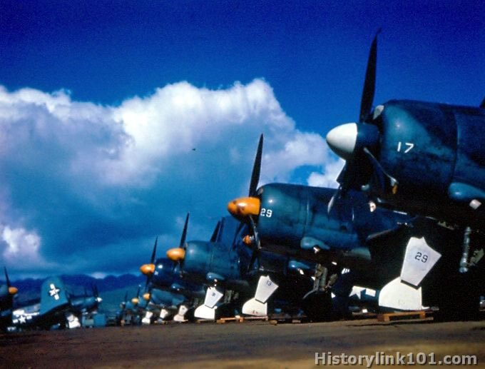 Rows of SB2C's with wings folded await their call to battle at a Pacific base. March 1945